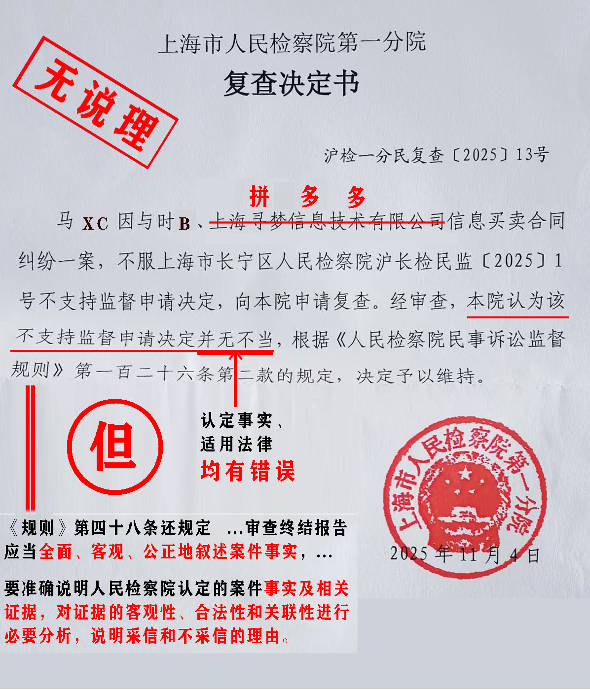 (一)《上海市人民检察院第一分院复查决定书》沪检一分民复查〔202513号,正文仅有133字(含标点符号),核心词只有一句话“经审查,本院认为该不支持监督申请决定并无不当”。